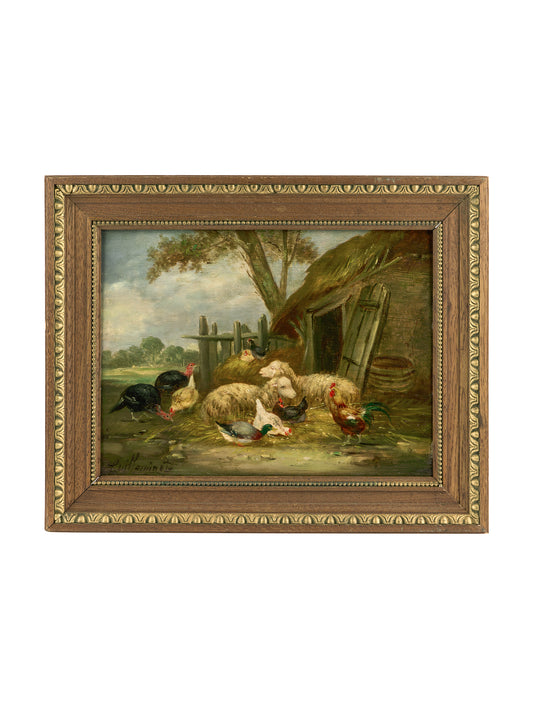 Vintage 19th Century Farmyard Oil Painting on Wood Panel