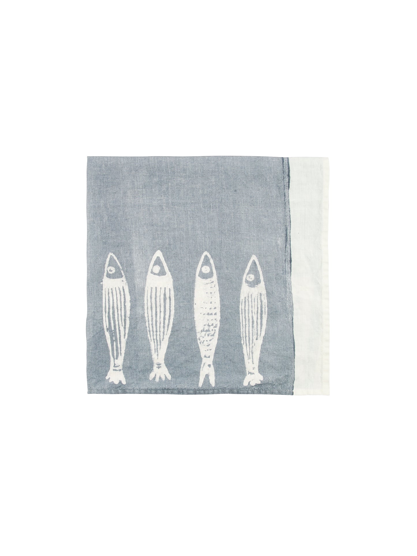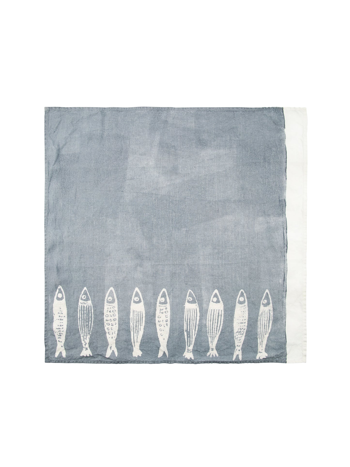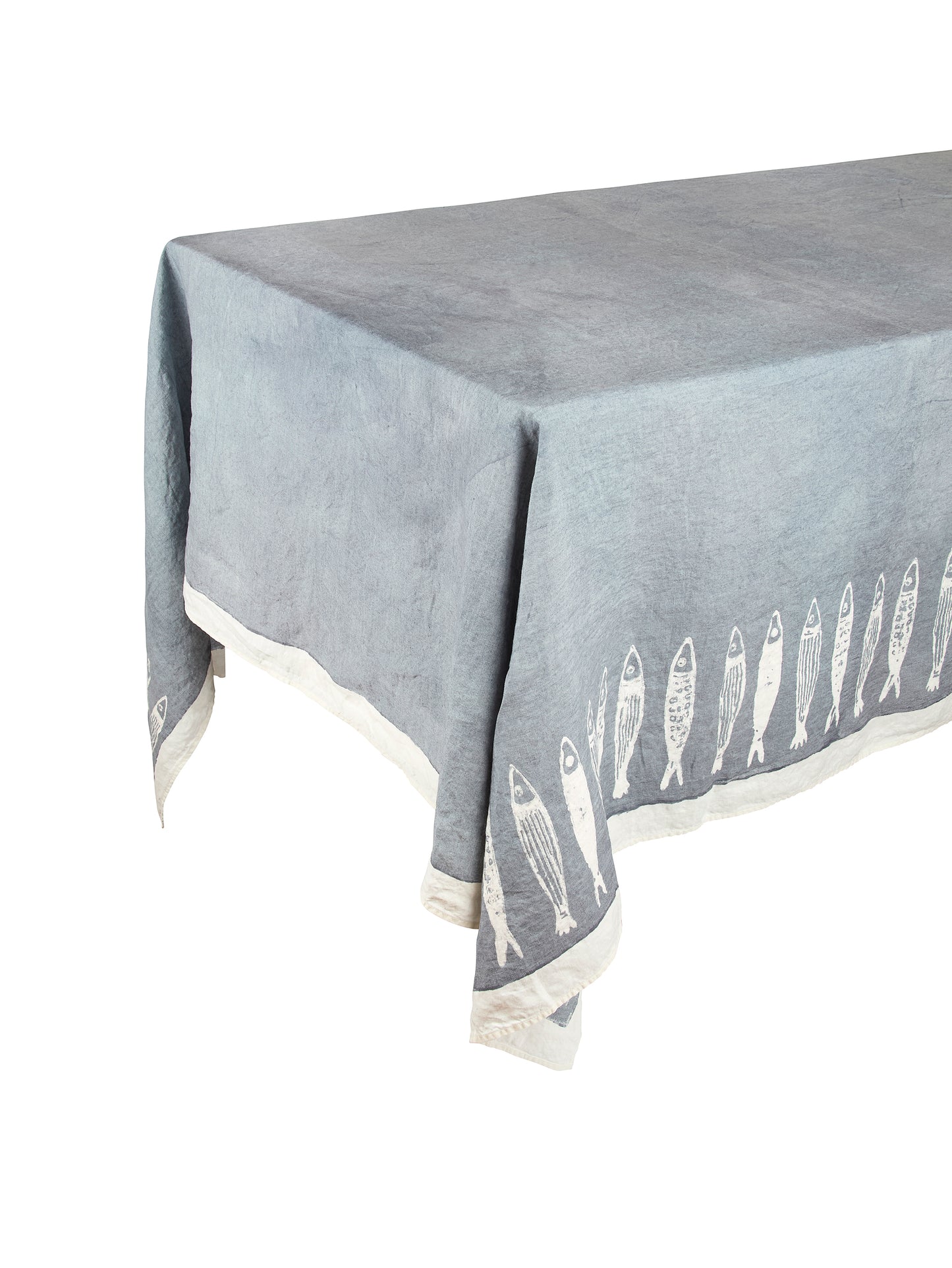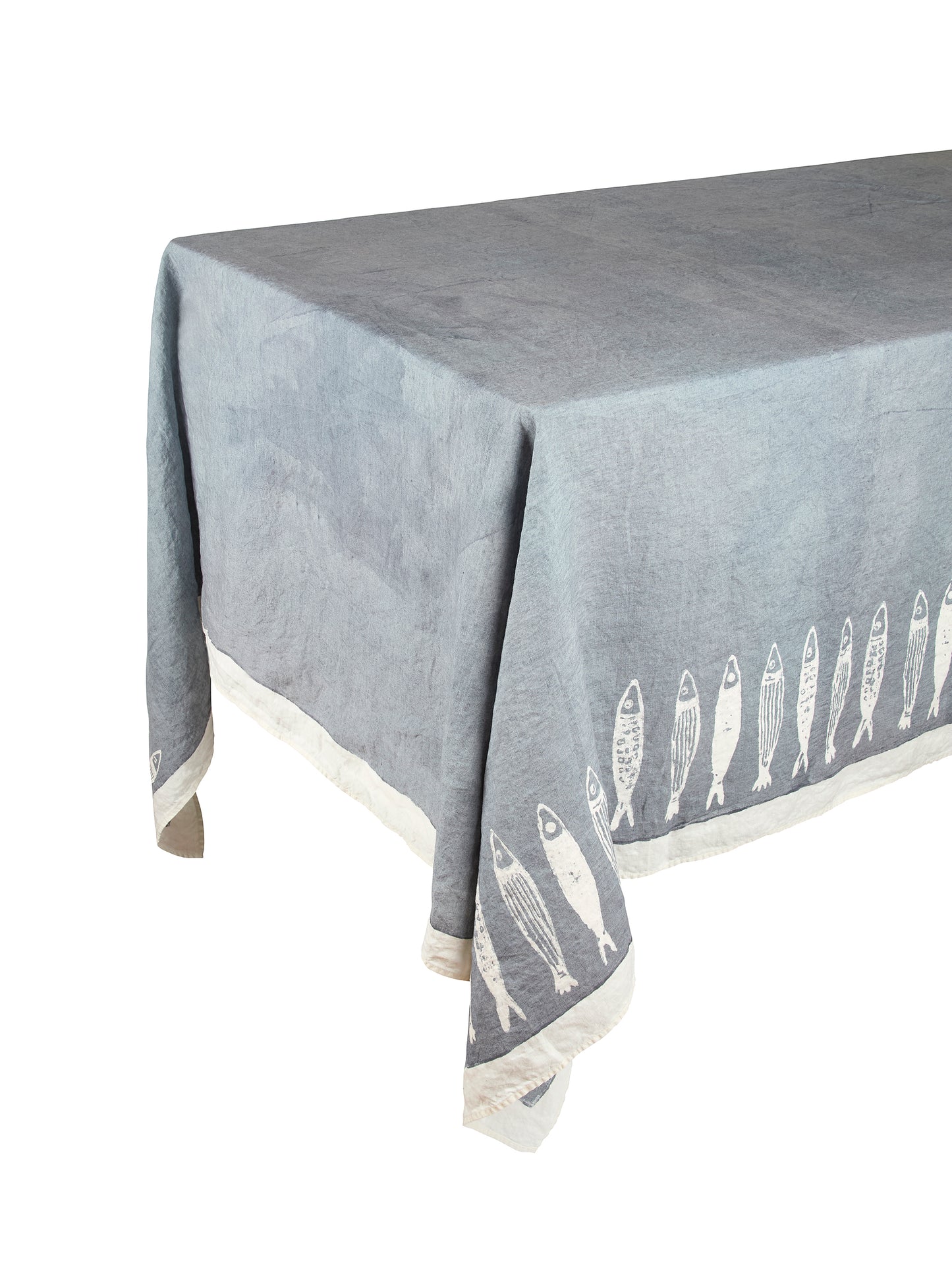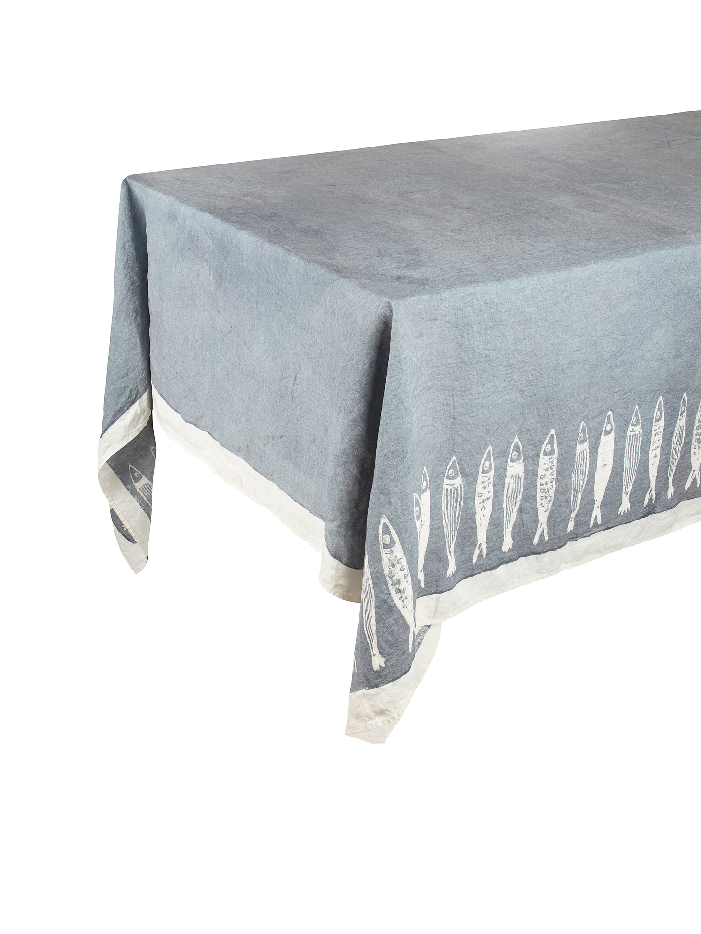 This ocean themed Italian tablecloth for casual living indoors and out is a pattern of hand stamped fish on a grayish blue linen background and is part of a centuries old family tradition of making one artisan crafted piece at a time.