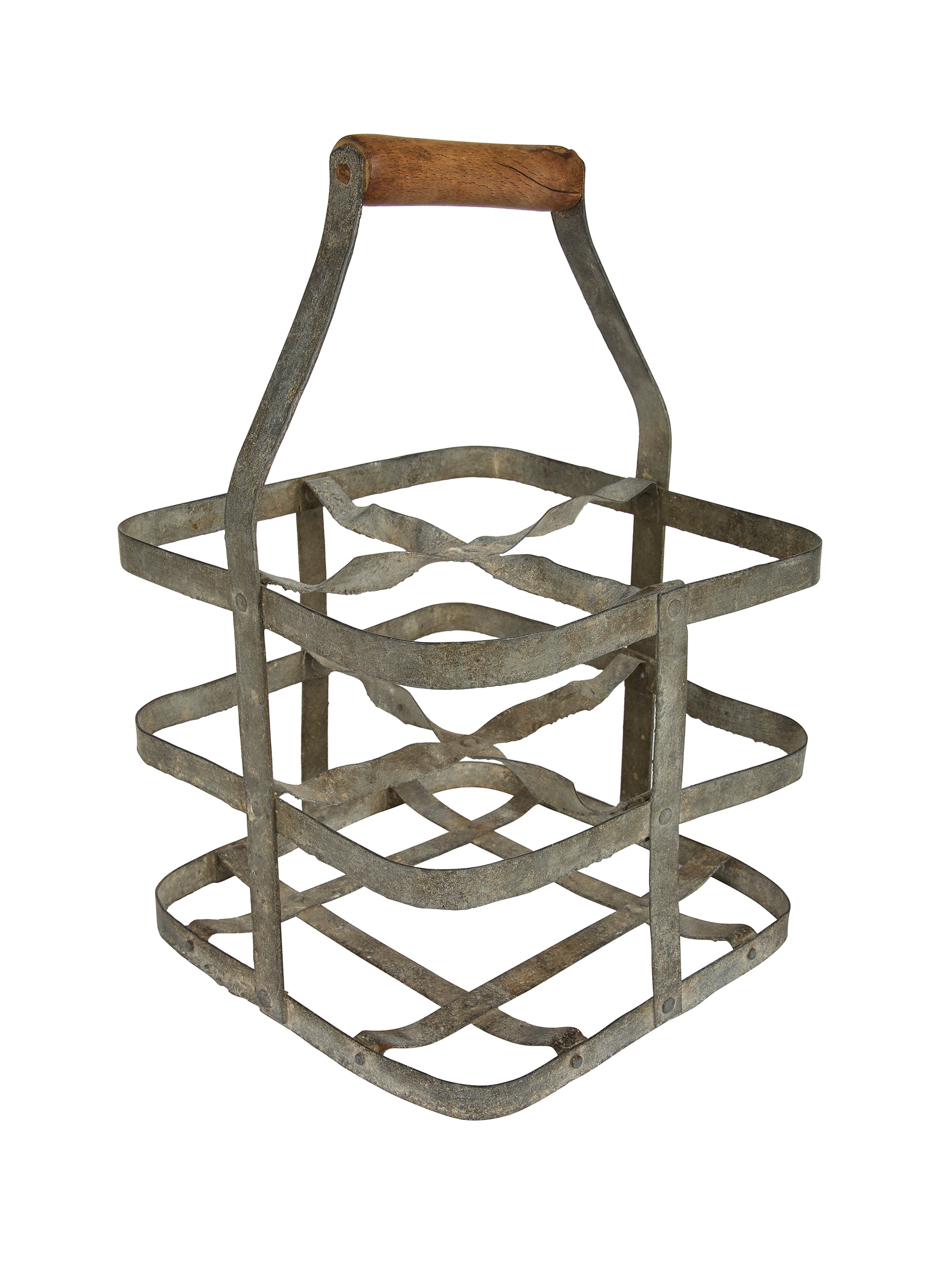 Made of weathered zinc with a soft matte finish, the piece bears the marks of daily use and timeworn charm. The wood handles, smoothed by years of carrying heavy glass, offer a tactile contrast to the cool metal frame.