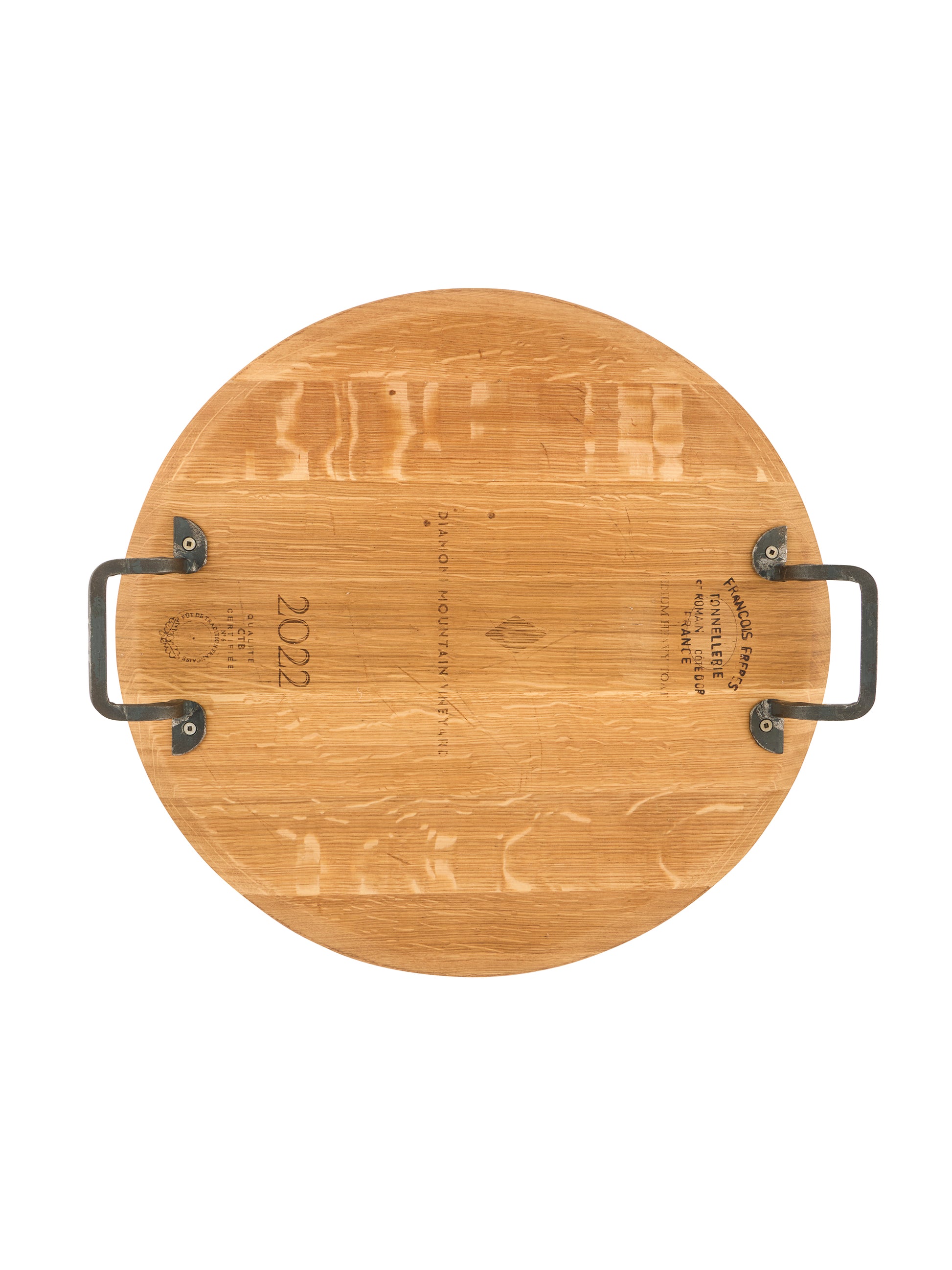 This vintage French wine barrel platter is crafted from the oak head of an old cellar barrel and fitted with hand forged wrought iron handles. The circular top shows the quiet marks of its former life in a working winery and the wood has the warm patina that only time and use create. Repurposed as a serving tray, it carries the weight and character of French cooperage and brings an authentic vineyard presence to the table. The iron handles add strength and a touch of rustic refinement. It serves cheese, bread, and charcuterie with easy charm and rests beautifully on a counter when not in use.Product Details