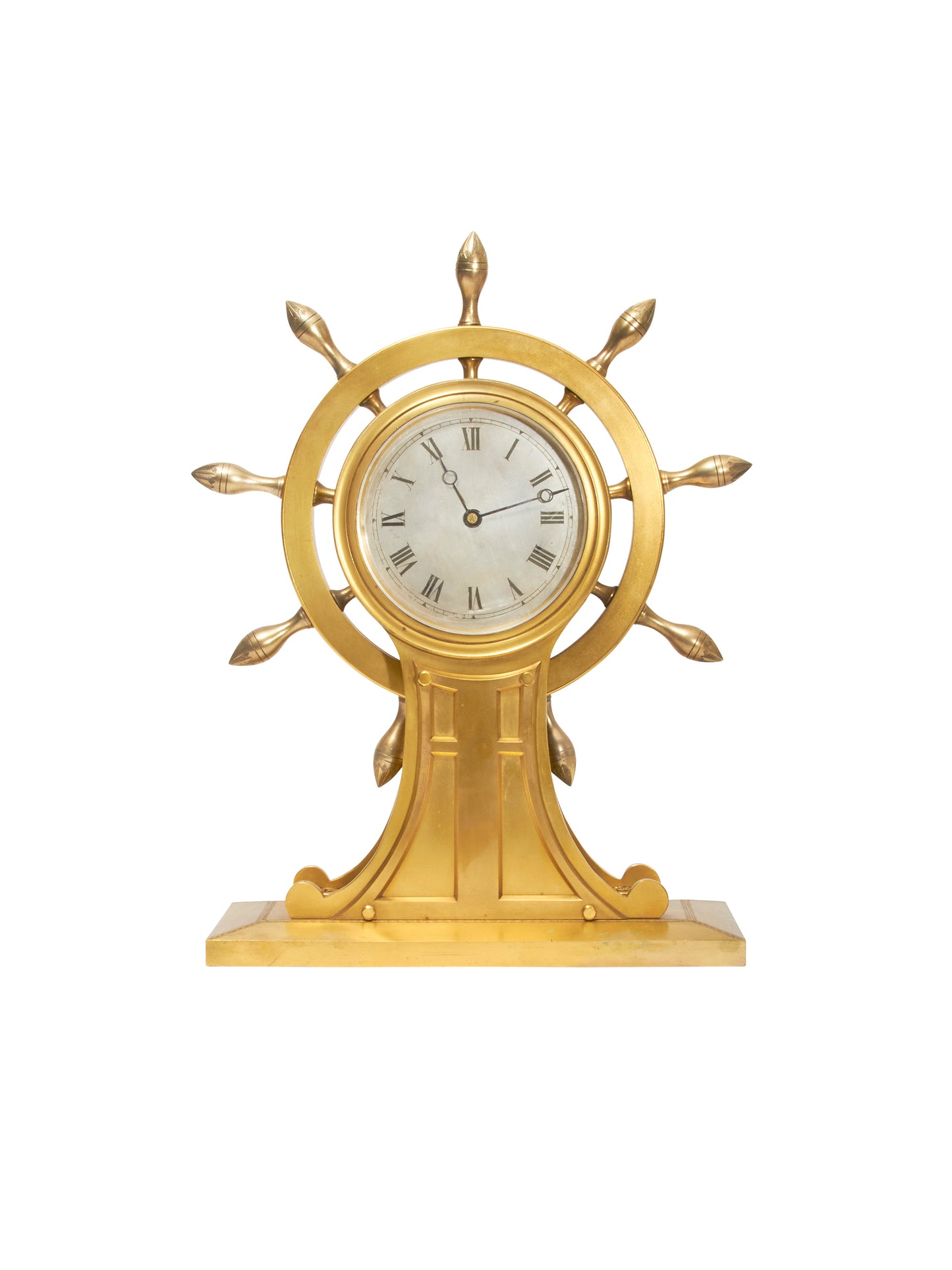 This 19th century nautical clock and barometer pair are electro-gilded matte and bright finished with engraved details to the bases and the ends of the handles. The fine ship's helm clock encloses a time piece with an English made movement and both the clock and the barometer have silvered faces engraved with calibrations and painted Roman numerals.