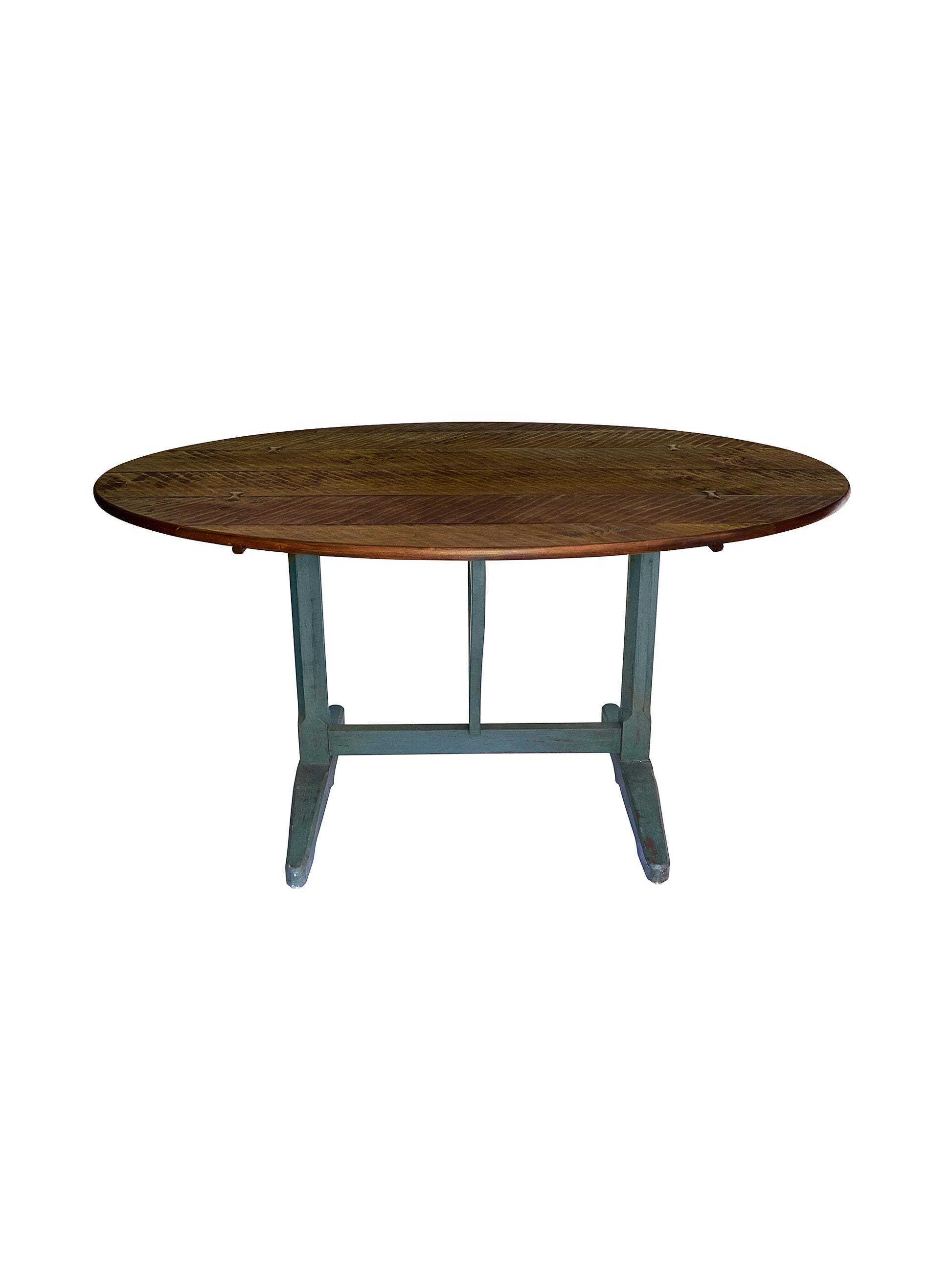 Handcrafted in the United States, this vintage five foot long wine table features a rich oval cherry top that folds with ease for moving and storage. Its trestle base, finished in a soft milk paint teal, adds a touch of rustic character and charm. Reminiscent of French wine tasting tables, it is versatile enough to serve as a dining table, yet carries the soul of a piece designed for convivial gatherings and spirited conversation. A timeless blend of function and beauty, it brings both heritage and practicality to the modern home.