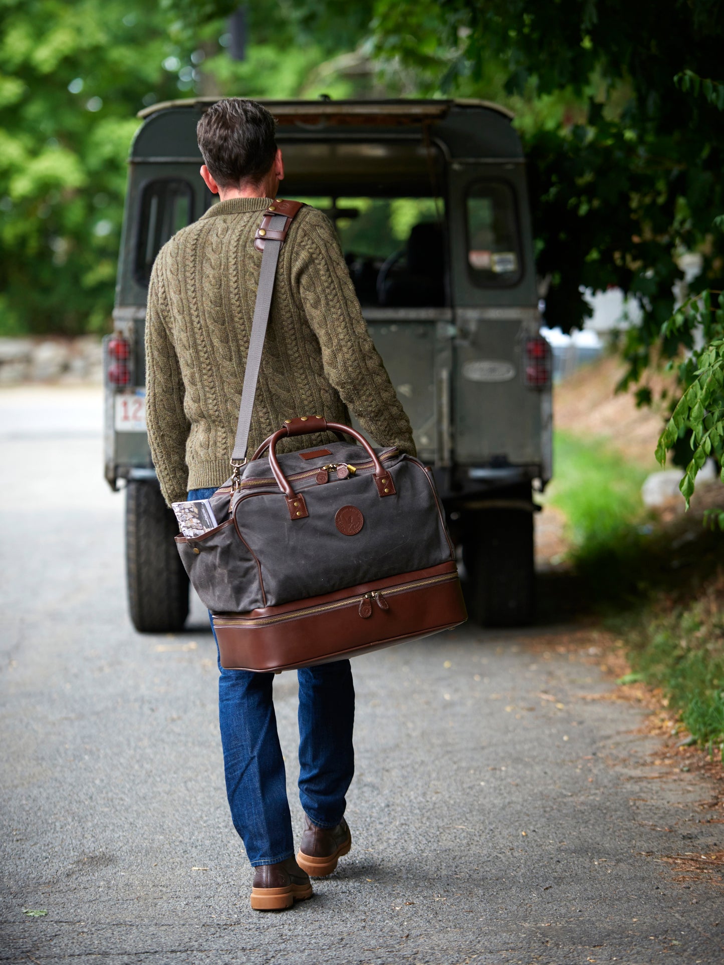 A finely appointed luxury vegetable tanned bridal leather and waxed twill canvas weekend classically styled duffle with durable solid brass hardware a, this travel gear has a spacious top compartment that holds all the weekend necessities and a lined bottom compartment for shoes and dirty laundry.