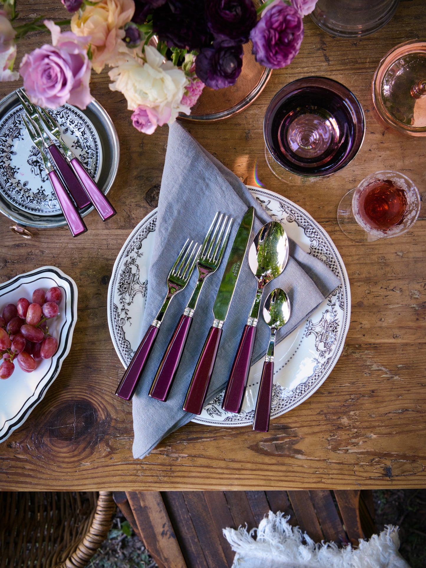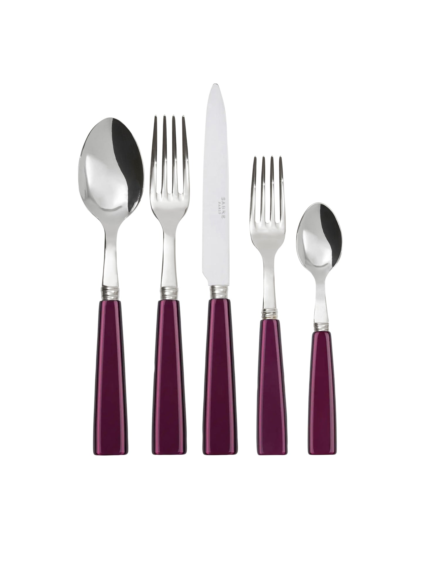 The flatware set includes a Japanese eggplant colored acrylic handled soup spoon, dinner fork, dinner knife, salad fork, and teaspoon.