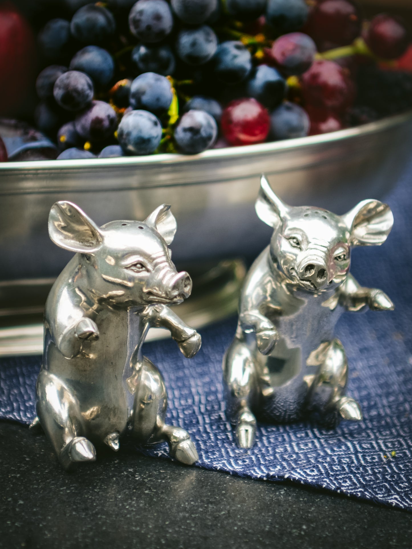 These happy Pewter Pig Salt and Pepper Shakers are designed by a family-owned American company.