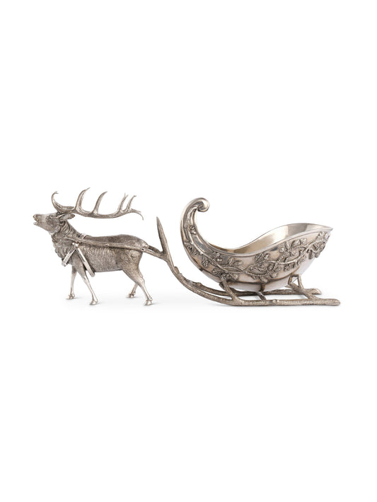 Celebrate the season with History Loves Company Holiday 2025, a dramatic holiday tableau where a pewter reindeer and sleigh of crimson roses set the scene for elegant living. MATCH Pewter liqueur glasses, vintage silver and gilt plateau trays, and Art Deco barware glow beneath a French floral still life. Oversized Assouline travel books rest beside a 19th century bust, while heirloom silver bells, a vintage gold horn, and an 1820s Sheffield wine cooler add festive grandeur. A rare English Imperial Measure, now holding bottles of wine, completes this inspired vision of timeless holiday beauty.