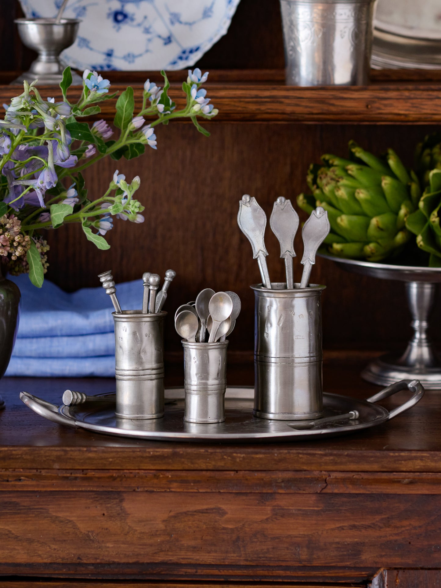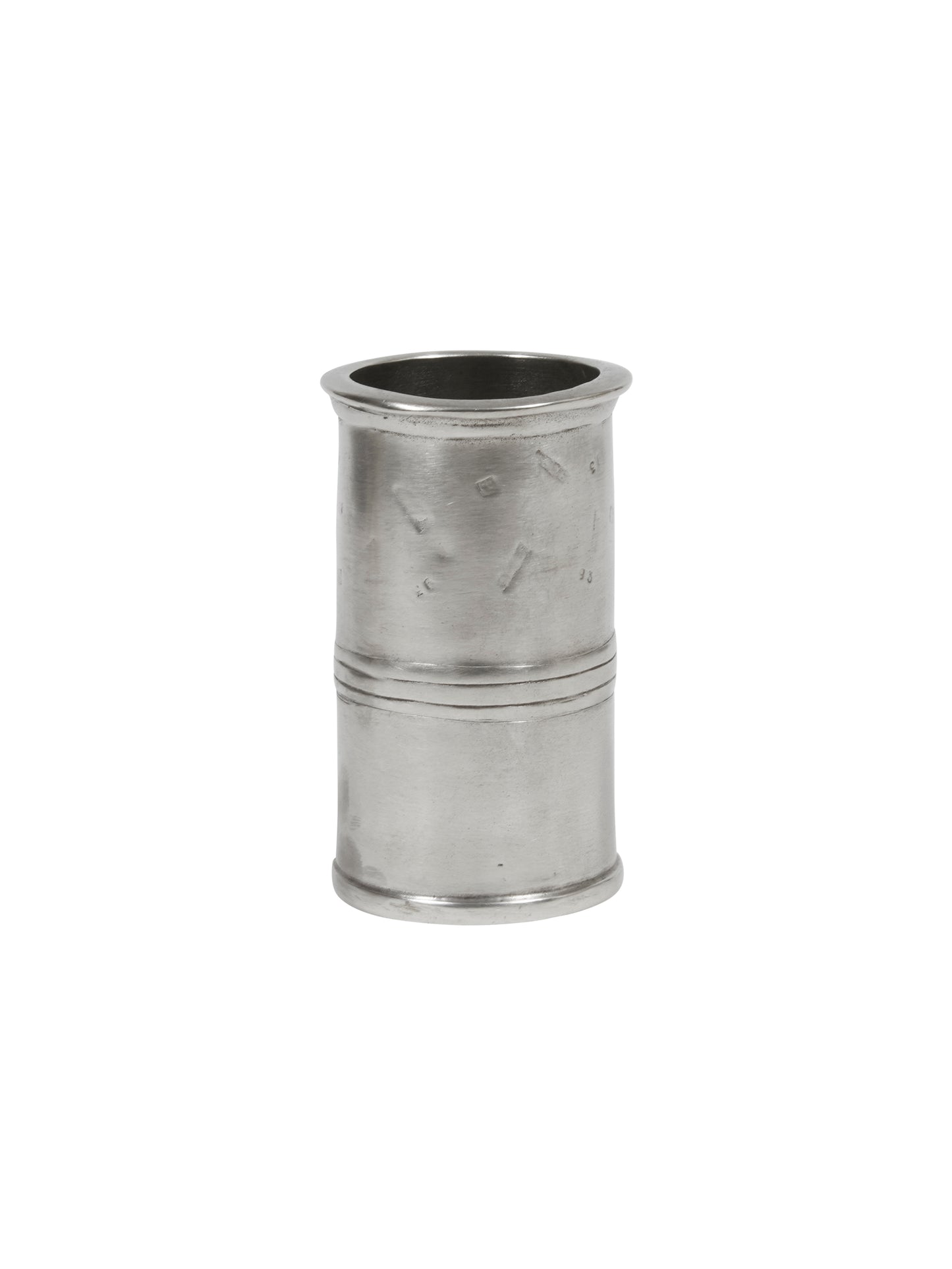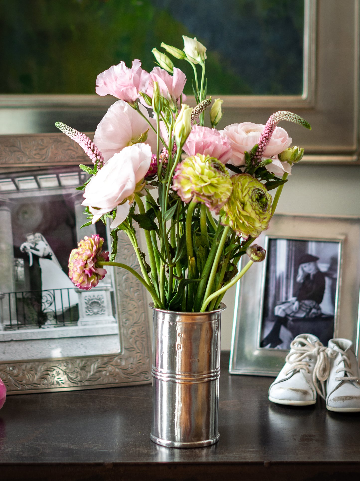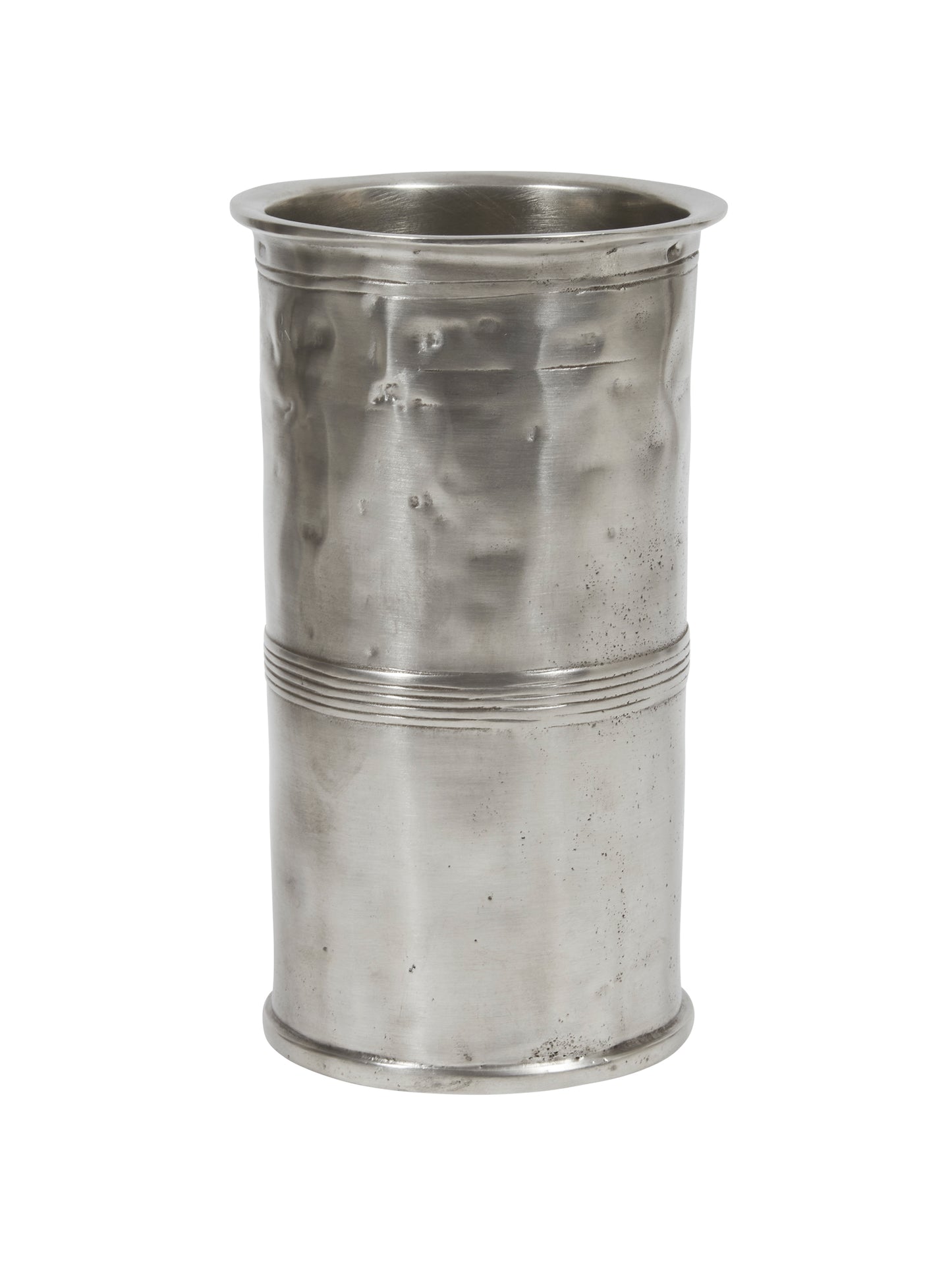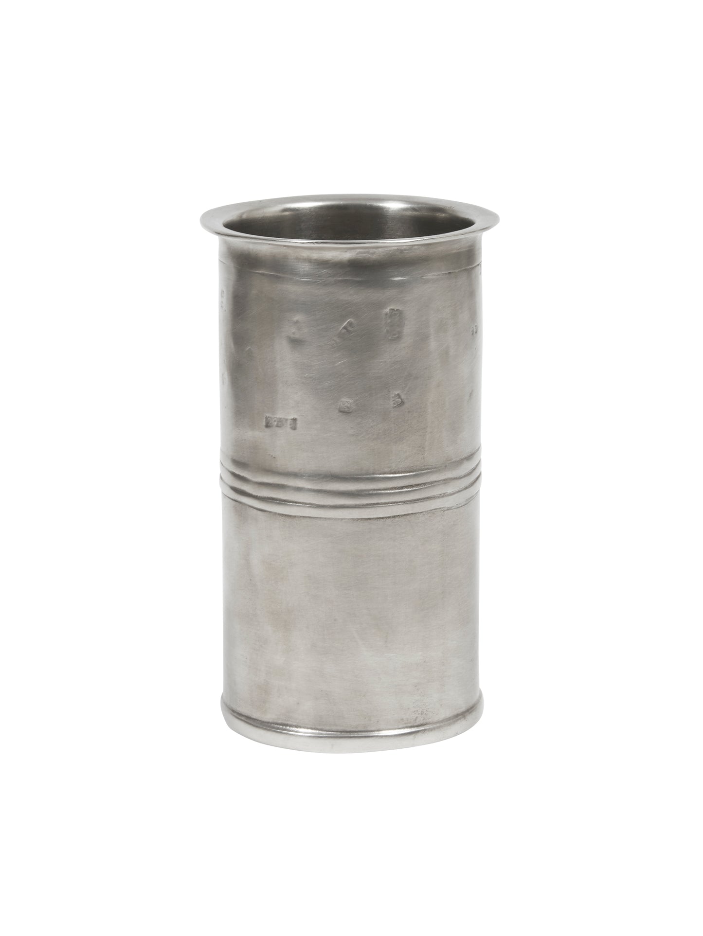 A modern take on an old world tool, this wide mouthed cylinder pewter vessel looks gorgeous filled with with flowers.