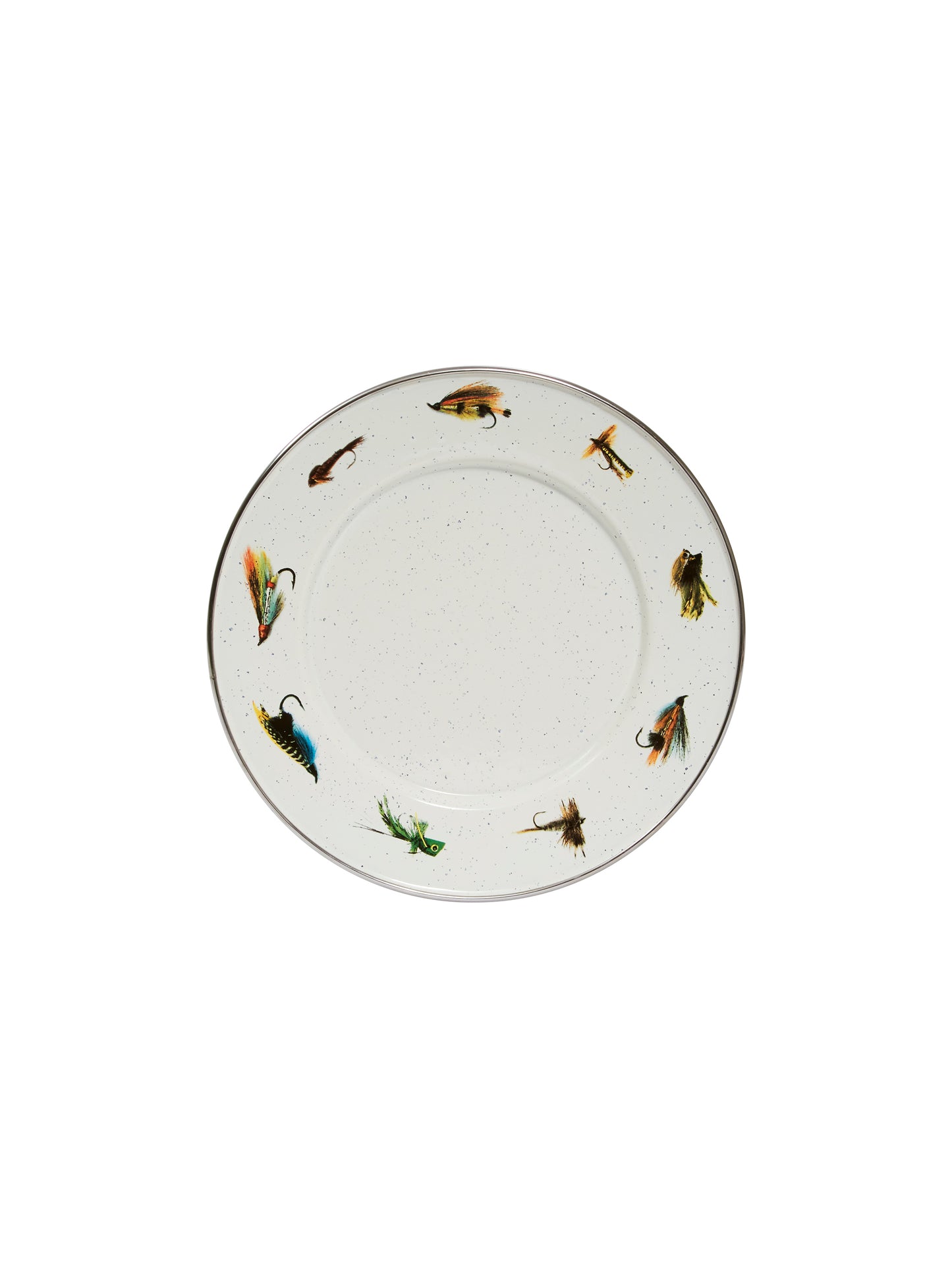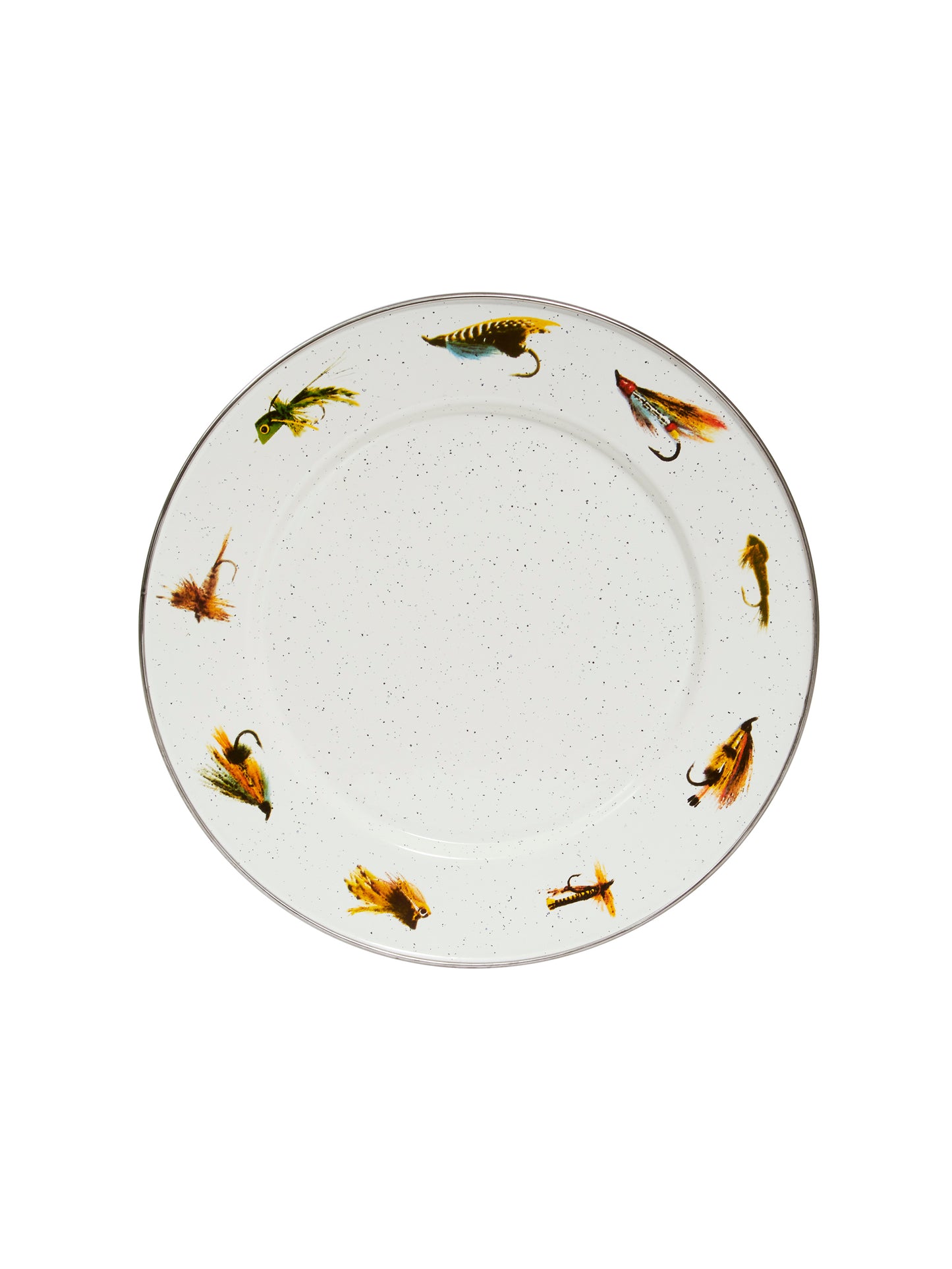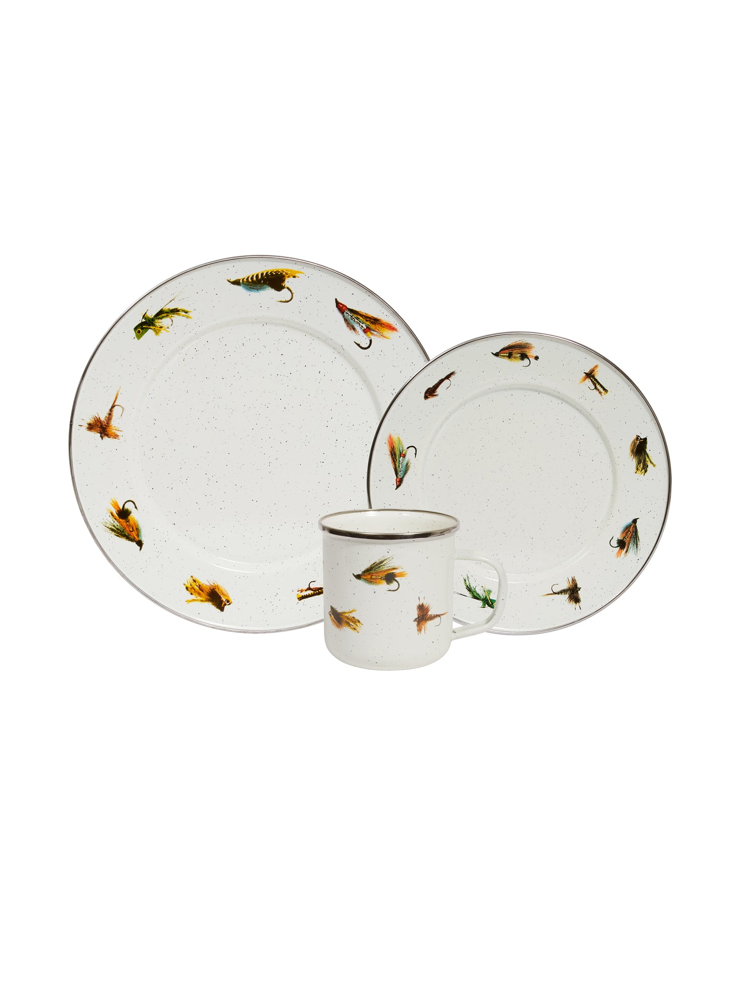 A fly fishing themed three piece porcelain coated steel set that includes a mug, sandwich or salad plate, and a dinner plate.