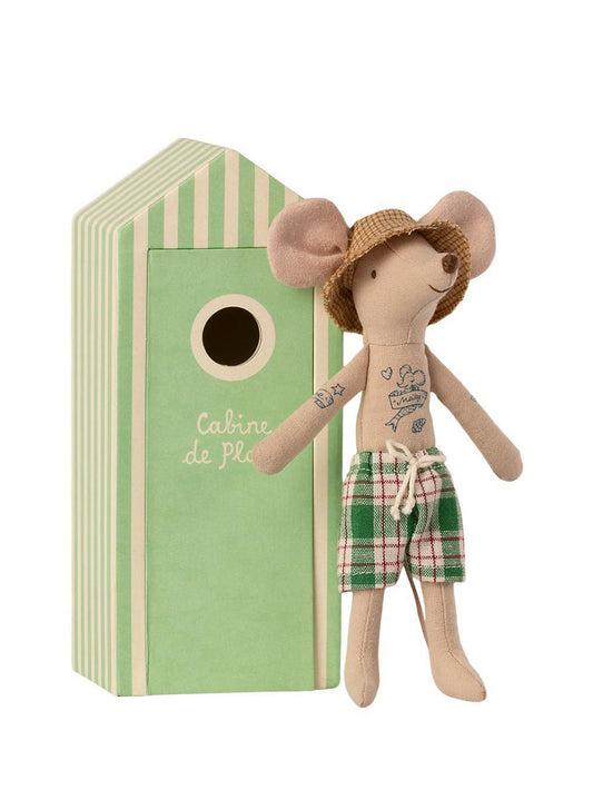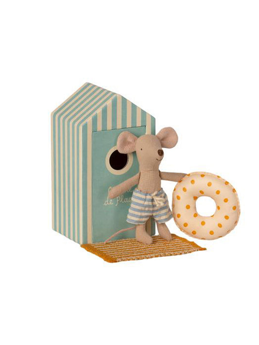 Each beach mouse comes with equipped for a day under the sun with a striped cabana and swimsuit. The Maileg Beach Mum wears a ruffled one-piece and printed bucket hat, the Maileg Beach Dad rocks tattoos and plaid swim trunks, and the Maileg Beach Big Brother prepares for a dunk in the ocean with flippers and goggles. Set yourself up for success and remember to pack the miniature-sized beach tote, umbrella, chairs, Sparkling water, Coca Cola, and tube of 20 SPF sunscreen. The mice may take the floaties, rubber boats, and surfboards out on the water for imaginative ocean play. With all the high tides and good vibes, this Maileg Beach Collection makes a fabulous gift for children and adults alike.