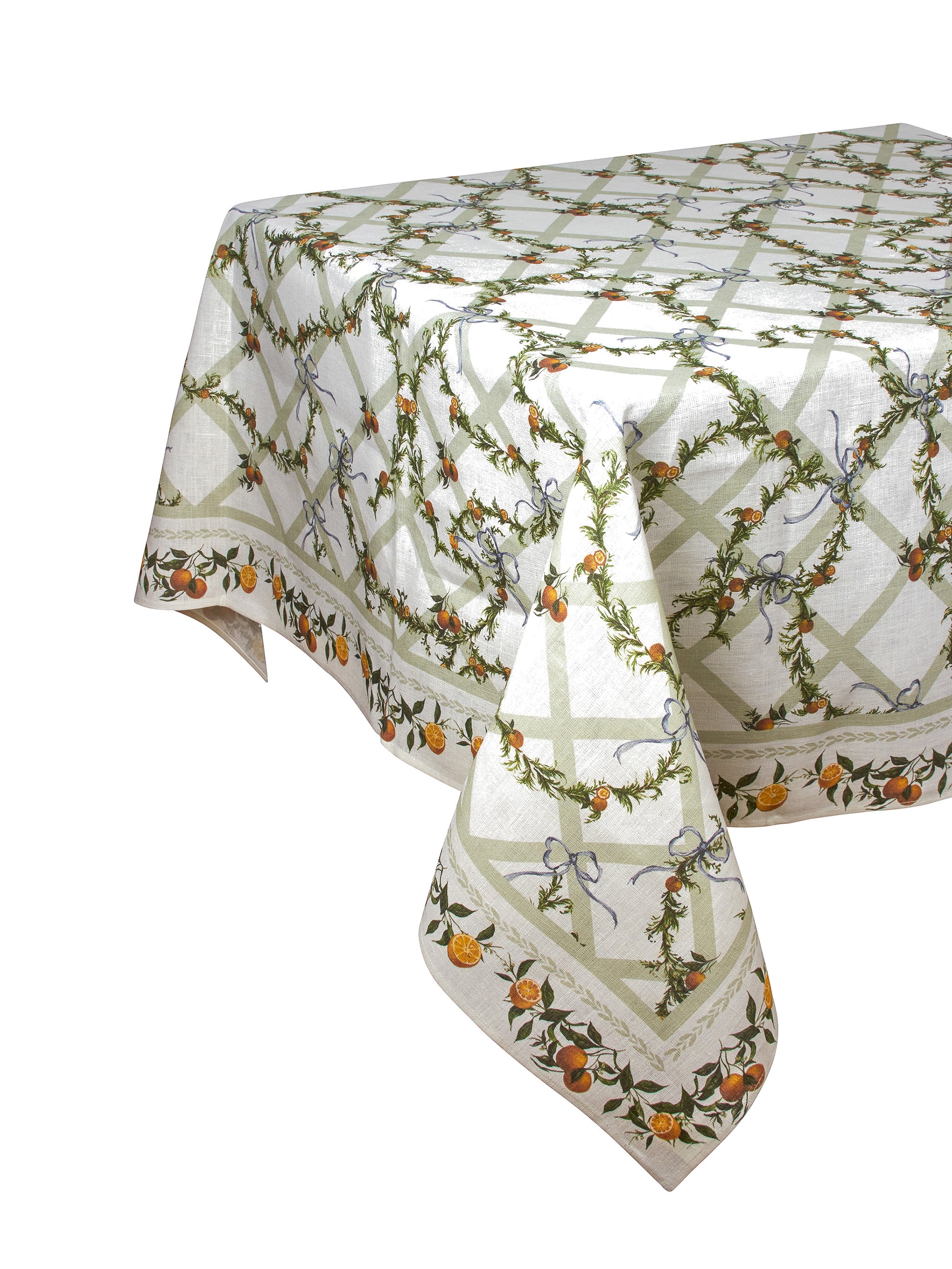 An original citrus and vine trellis design hand painted by Nadia Collela and screened onto easy care table linens makes an extraordinarily colorful and classic edition to a breakfast nook, a lady's lunch, or a garden party tablescape.