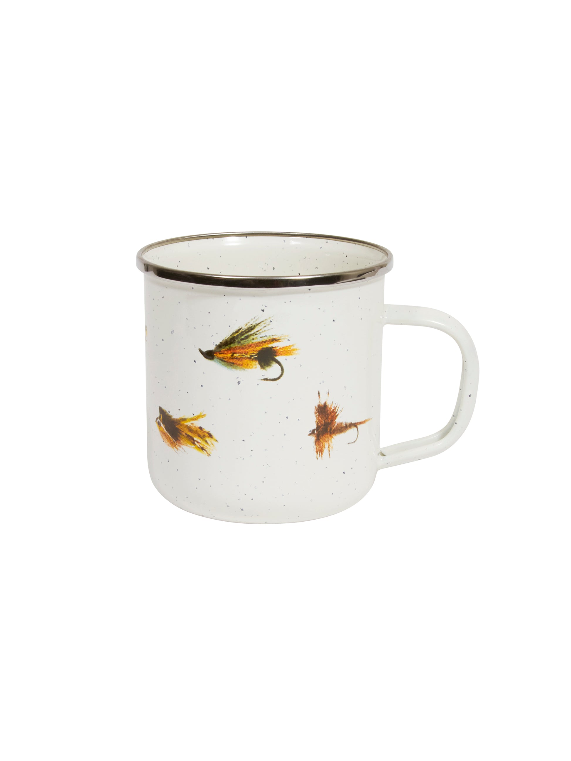 A fly fishing themed three piece porcelain coated steel set that includes a mug, sandwich or salad plate, and a dinner plate.
