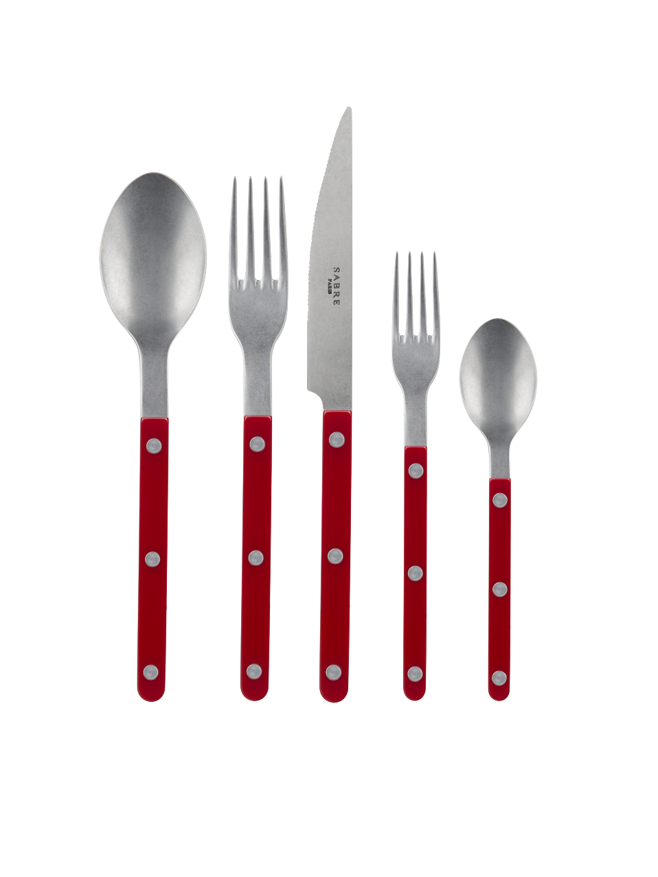 Sabre Paris flatware designed to showcase the French bistro aesthetic—a simple, yet elegant pattern for everyday bread breaking with a modern twist: gorgeous brightly colored riveted handles.