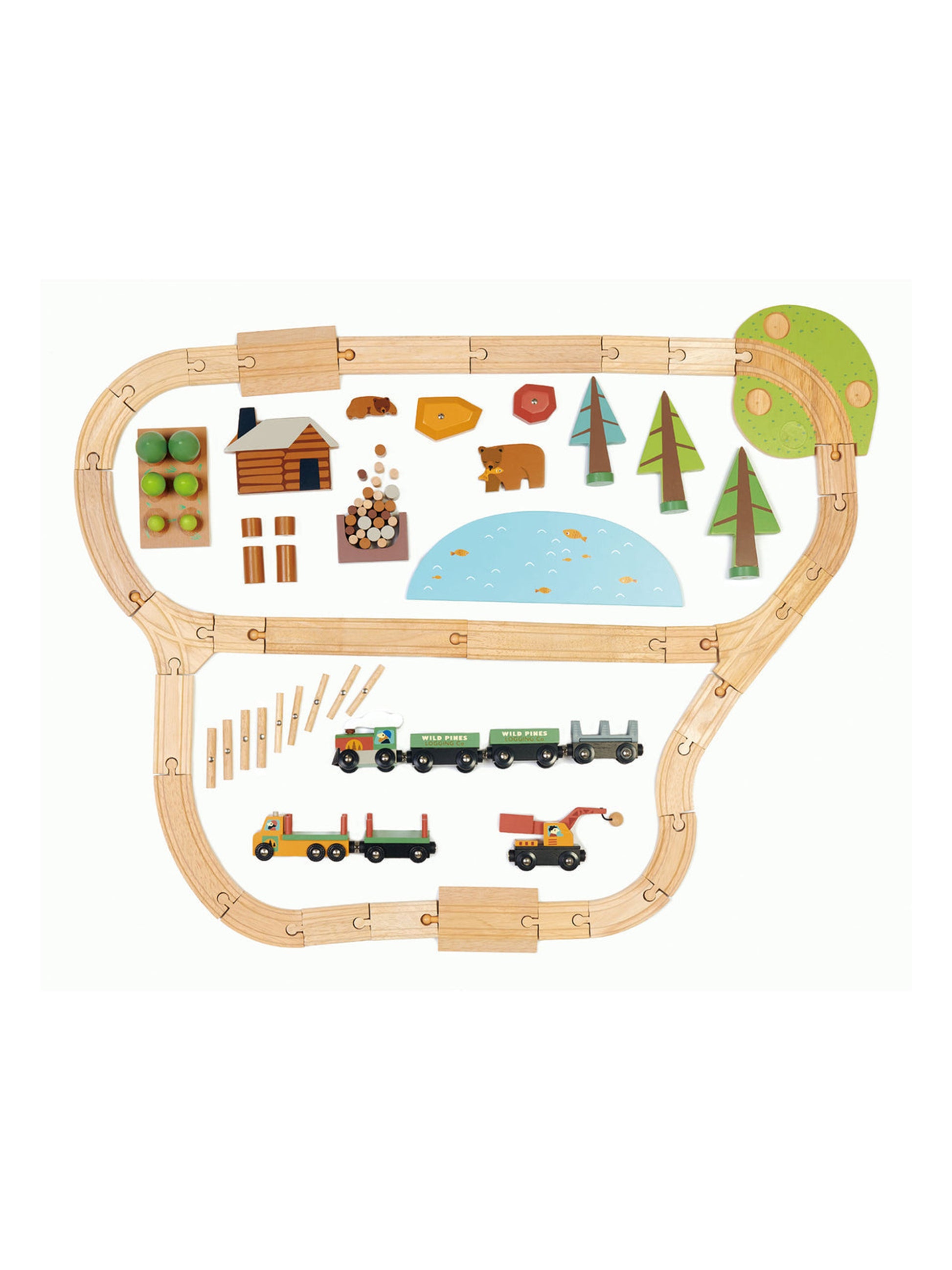An heirloom quality wooden train set with 30 pieces of track and eco-friendly water-based non-toxic painted accessories including an engine and two other vehicles to roll along the tracks.Product Details