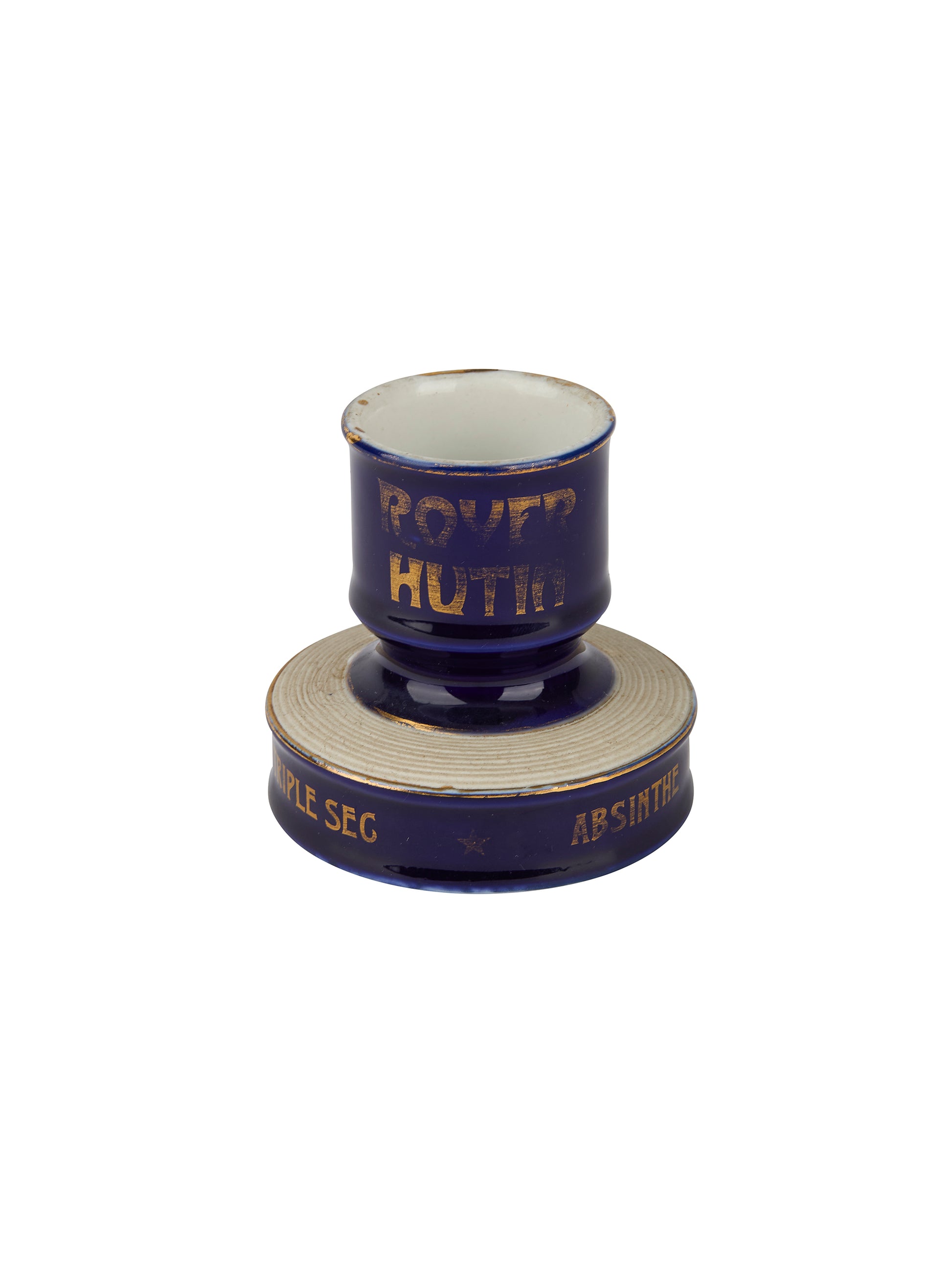 This Belle Époque France ceramic match striker once rested on the zinc countertops of Parisian cafés where absinthe flowed and conversation lingered. Its deep navy glaze, softened by time, frames white lettering that advertised the green fairy and her favored distillers, including the storied houses of Samson and Gaillard. It is an object made for ritual and reflection, a small but essential part of the theatre of daily life in the era of Toulouse-Lautrec and Verlaine. With its worn surface and generous proportions, this match striker carries the memory of flickering flames and the quiet moments they once lit. A poetic accent for a writing desk or bar, it speaks to a time when utility was never without elegance.
